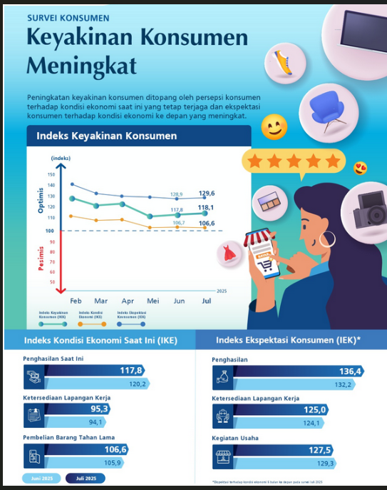 Sementara itu, Survei Konsumen Bank Indonesia pada Juli 2025 mengindikasikan keyakinan konsumen RI terhadap kondisi ekonomi meningkat dibandingkan bulan sebelumnya. Hal ini tecermin dari Indeks Keyakinan Konsumen (IKK) Juli 2025 yang berada pada level optimistis (indeks >100) sebesar 118,1, lebih tinggi dibandingkan bulan sebelumnya 117,8.