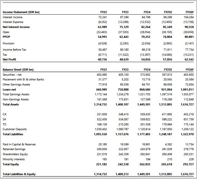 Manajemen mempertahankan proyeksi pertumbuhan kredit untuk setahun penuh 2025 di kisaran 6–8% yoy, dan memperkirakan terakselerasi menjadi 8–10% pada 2026.