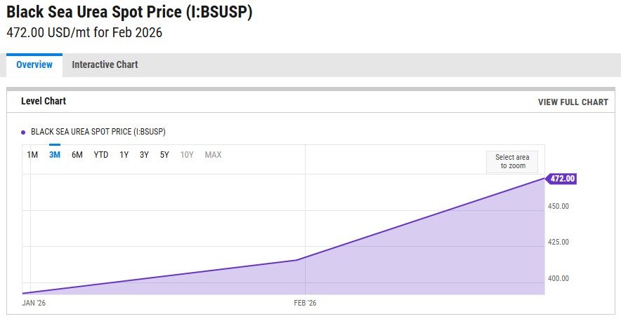 Setelah serangan Israel di Februari 2026, harga spot pupuk urea di kawasan Laut Hitam tercatat meroket tembus USD 472 per metrik ton pada akhir bulan lalu. Harga ini melonjak 20% lebih dibanding awal Januari.