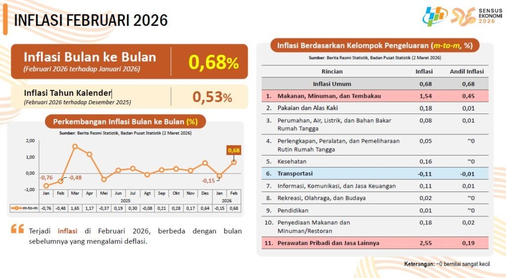 Sementara itu, Badan Pusat Statistis mencatat, pada bulan Februari 2026 terjadi inflasi sebesar 0,68 persen secara month to month (mtm). Hal itu berbalikan arah dibanding pada Januari 2026 terjadi deflasi 0,15 persen dan pada Februari 2025 deflasi 0,48 persen. Inflasi ini terutama disumbang lonjakan harga makanan dan minuman.
