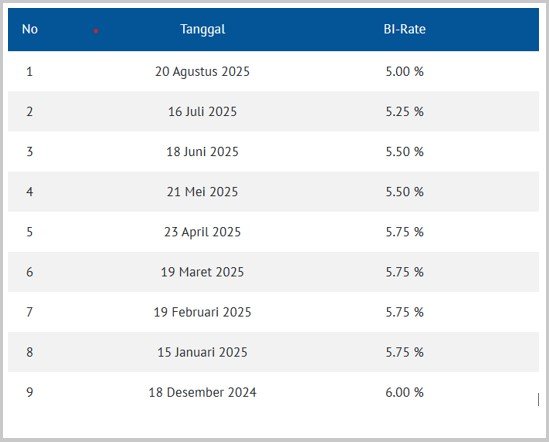 Kemungkinan ditahannya BI Rate pada RDG bulan ini juga mengingat BI telah cukup agresif menurunkan bunga acuan di bulan-bulan sebelumnya. Pada Januari, Mei, Juli, dan Agustus tahun ini, BI Rate telah dipangkas masing-masing 25 bps, dari 6% Desember 2024 menjadi kini 5%.
